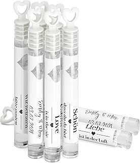 Seifenblasen Hochzeit Set mit Name + Datum personalisierte Sticker Etikett Aufkleber 24 teilig mit Herzgriff - für Hochzeit Gastgeschenk Taufe Geburtstag Goldene Hochzeit Verlobung Valentinstag