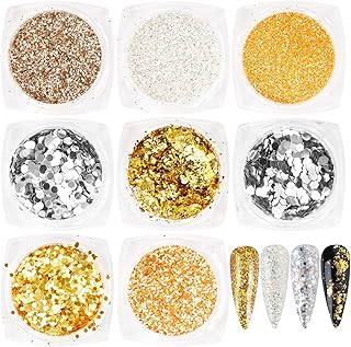 FLOFIA 8 Boxen Nagel Pailletten 3D Holographische Glitzer Gold Silber Nageldeko Strassstein Glänzend Nagellackpulver für Nägel Nail Art Pailletten Strass Nagelkunst Maniküre