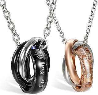 2 Stück Partner Anhänger Halskette, Zirkonia Edelstahl Halskette Kette Her King, His Queen Gravur DREI Ringe Ring Rose Gold Schwarz Silber Valentines Partner Ketten Herren,Damen Set
