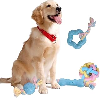 Welpen-Kauspielzeug-Set, 4-teiliges Macaron-Farbspielzeug für Hunde zum Trainieren und Reinigen der Zähne, mit Kugel- und Baumwollseilen für kleine Welpen und mittlere Hunde